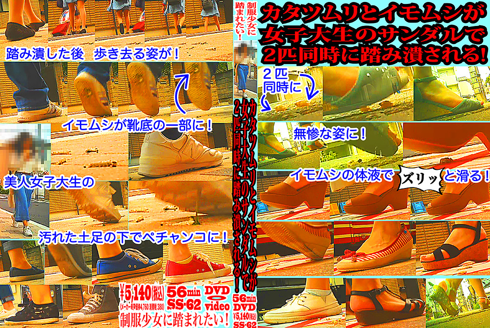 おなじみ「偶然クラッシュ」!今回は雨上がりの路上に這い出してきたカタツムリが女子大生のサンダルのつま先で2匹同時に踏み潰される場面が!さらにイモムシを踏み潰し、はみ出した体液で「ズリッ」と滑る場面!イモムシの全身が汚れた靴底に貼りつく場面も! (もっと見る)